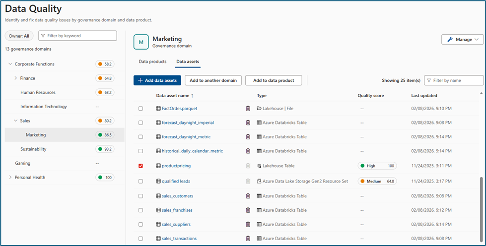Organizations can use a single Purview Data Quality solution to manage both standalone assets and data product–associated assets, including issue remediation.