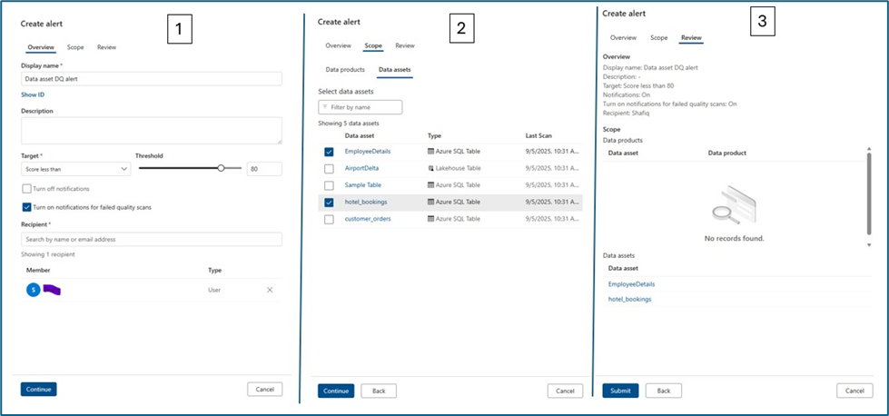 Additionally, you can configure alerts to notify your team when a data quality score falls below a defined threshold or when a data quality scan fails.