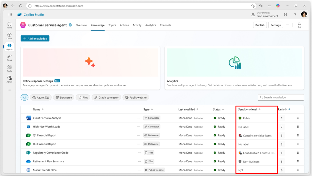 For example, a financial advisor building an agent in Copilot Studio might connect multiple Dataverse tables, some labeled as “General” and others as “Highly Confidential.” If a response pulls from both, it will inherit the most restrictive label, in this case, "Highly Confidential,” to prevent unauthorized access and ensure appropriate protections are applied across both maker and users of the agent.