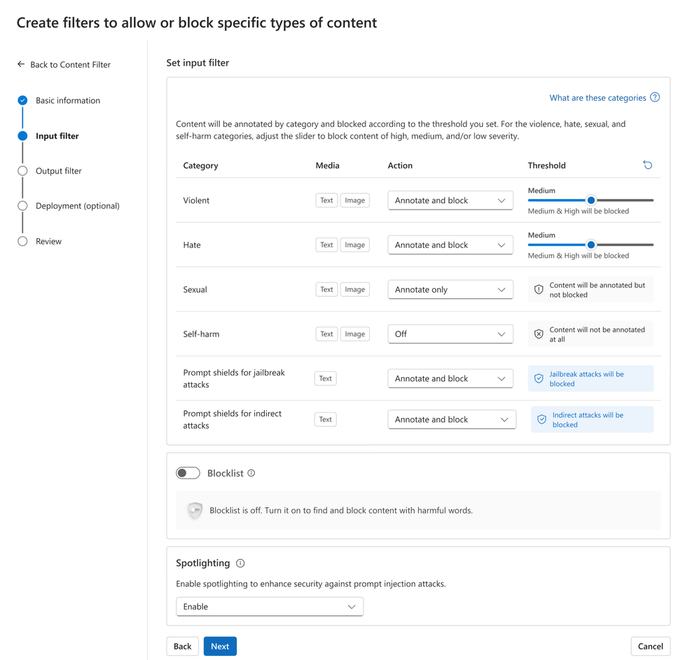 Figure 1: Enable Spotlighting in Azure AI Content Safety to detect potential indirect prompt injection attacks