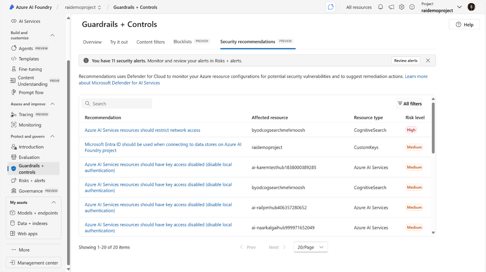 Figure 4b: Developers can view recommendations on the Guardrails + controls page in Azure AI Foundry