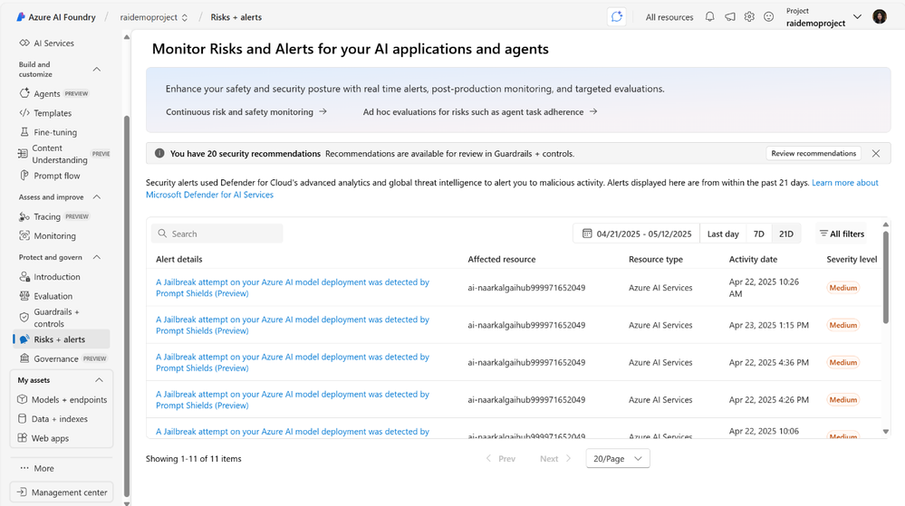 Now in preview, Microsoft Defender for Cloud integrates AI security posture management recommendations and runtime threat protection alerts directly into the Azure AI Foundry portal. These capabilities, previously announced as part of the broader Microsoft Defender for Cloud solution, are extended natively into Azure AI Foundry enabling developers to access alerts and recommendations without leaving their workflows. This provides real-time visibility into security risks, misconfigurations, and active threats targeting their AI applications on specific Azure AI projects, without needing to switch tools or wait on security teams to provide details.