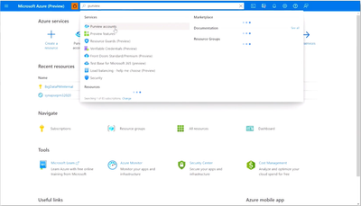 After you create an Azure account, sign into the Azure portal and search for Purview accounts.