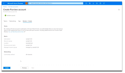 Then select Create to start an Azure Purview account. Note that you can add only one Azure Purview account at a time.
