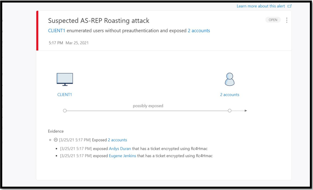 The reconnaissance portion often involves the attacker preforming enumeration techniques to find users that have the pre-authentication attribute turned off. If the reconnaissance was performed with LDAP it will result in triggering Active Directory attributes reconnaissance (LDAP) alert. This alert triggers when certain attributes are enumerated.