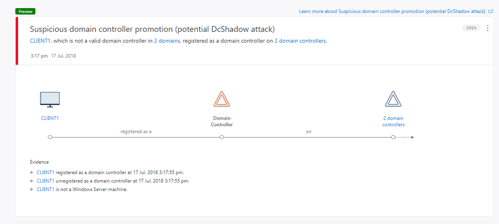 Any suspicious Domain Controller registration or suspicious replication requests against an Azure ATP-protected Domain Controller, the Suspicious Activity detection signals an alert in the Azure ATP timeline, as shown below.