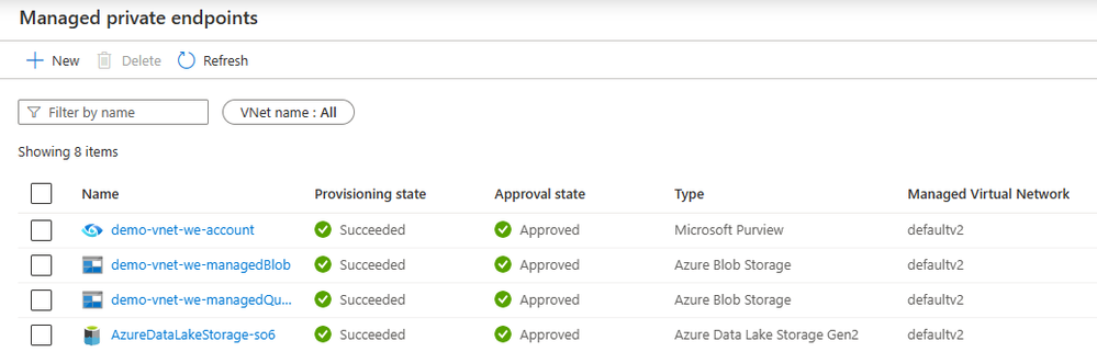 - When you click on manage or create the managed private endpoints (PE), you will see the Managed VNet name as “defaultv2”. Private endpoints to Purview and its storage account are auto created when you create the Managed VNet IR. Approve those PEs to establish secured connectivity.