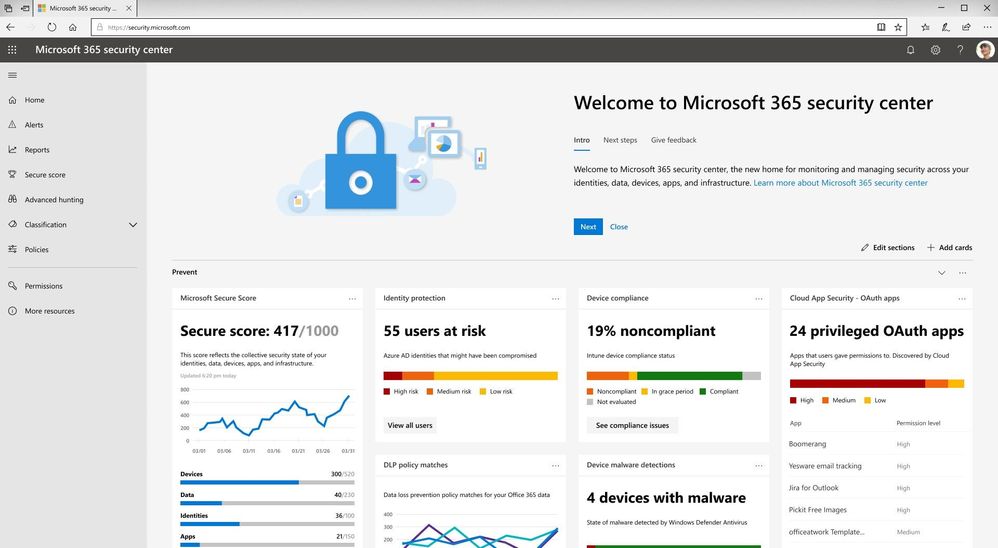 The new Microsoft 365 security center provides security administrators and other risk management professionals with a centralized hub and specialized workspace that enables them to manage and take full advantage of Microsoft 365 intelligent security solutions for identity and access management, threat protection, information protection, and security management. With it they’ll gain the visibility, control, and guidance necessary to understand and act on the threats that their organization is facing today, have faced in the past, and may face in the future.