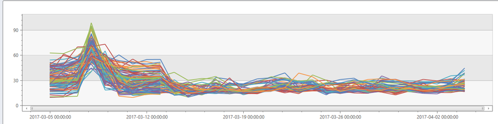 Initially, our thresholds were 45% of capacity as “red” line, and 30% as “orange” line to account for any errors in our models. We also chose a preference toward over-provisioning rather than over-optimizing for perf and scale. A snapshot of such a chart is included below in Figure 1. The blue bars represent our maximum capacity, the black lines represent our current workloads, and the orange and red lines represent their respective thresholds. Each blue bar represents one ASF cluster (refer to first blog on ASF). Over time, once we verified our models, we increased our thresholds significantly higher.