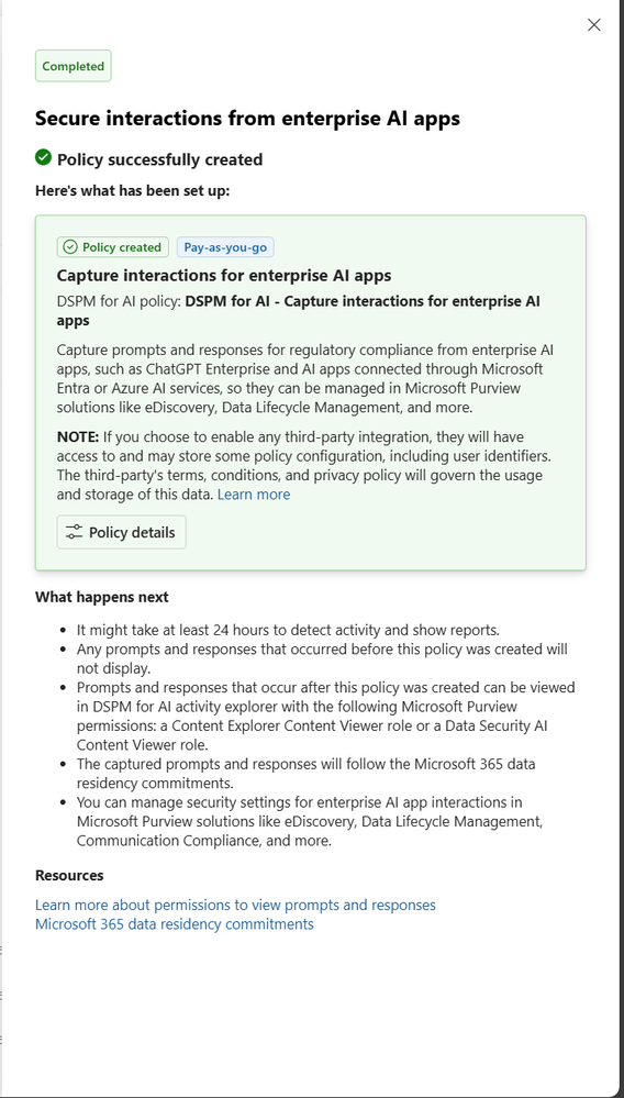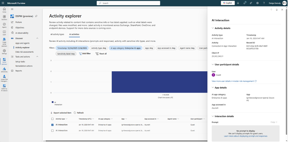 - Visibility within 24 hours. Data Security Posture Management (DSPM) shows you total interactions, sensitive data detected in prompts and responses, user activity across AI apps, and insider risk scoring. This dashboard exists the moment you flip the toggle.