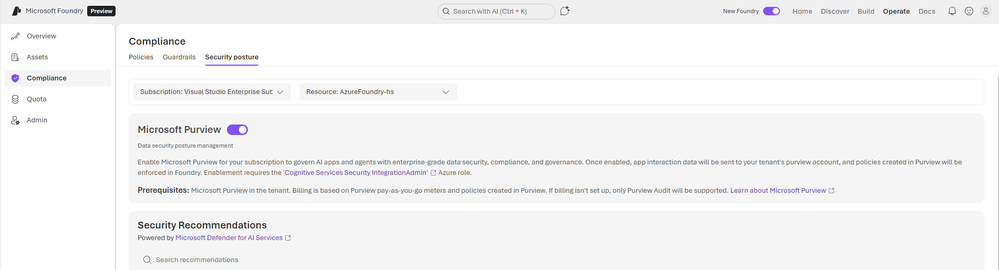 Microsoft Foundry now includes native integration with Microsoft Purview. When you enable it, every AI interaction in your subscription flows into the same enterprise data governance infrastructure that already protects your Microsoft 365 and Azure data estate.