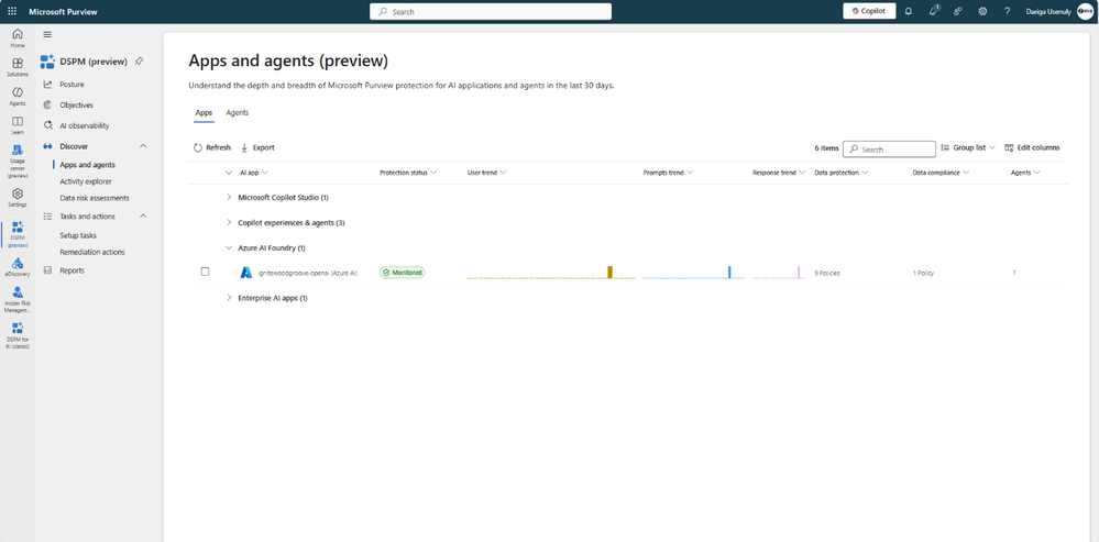 Navigate to DSPM > Discover > Apps and Agents to review and monitor the Foundry apps built in your organization