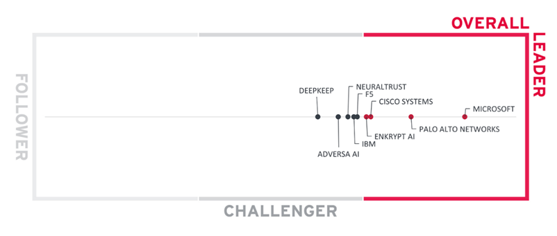 Figure 1: KuppingerCole Generative AI Defense Leadership Compass chart highlighting Microsoft as the top Overall Leader, with other vendors including Palo Alto Networks, Cisco, F5, NeuralTrust, IBM, and others positioned as challengers or followers.