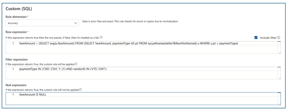 Each part of the rule works similarly to existing Microsoft Purview Data Quality conditions. A rule only passes if the row expression evaluates to TRUE for the dataset that matches the filter expression and handles missing values as specified in the null expression.