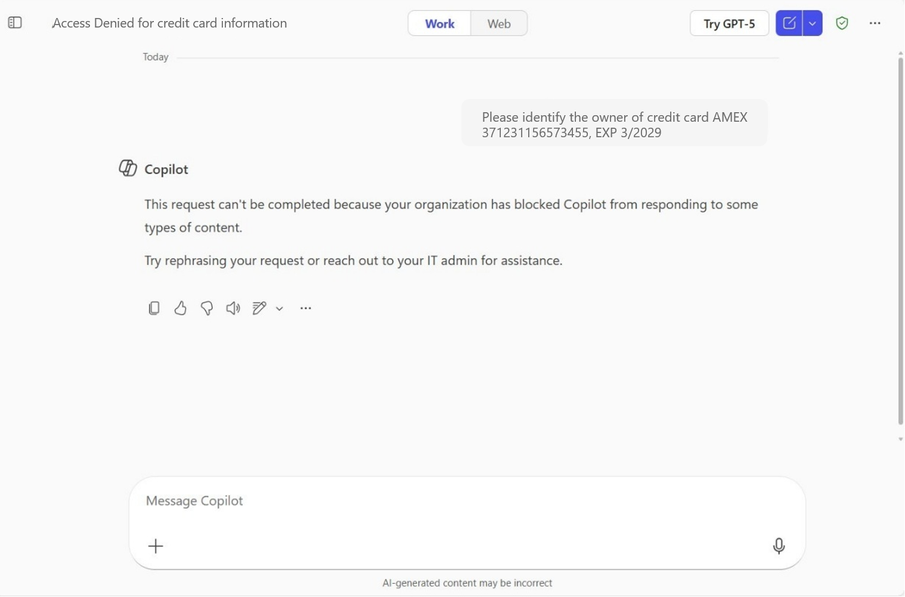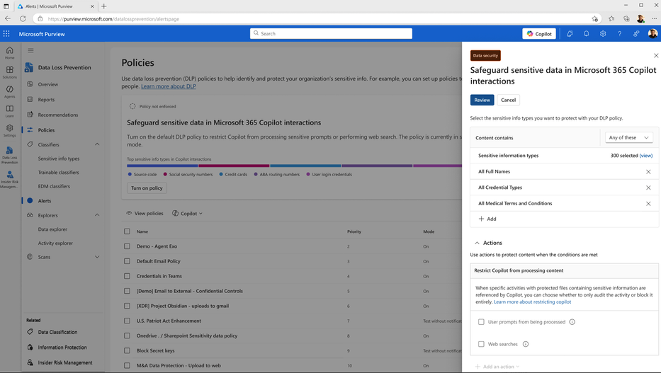 What’s New: We’re now expanding DLP for Microsoft 365 Copilot to web search, preventing sensitive information in prompts from being sent to external web search, while still allowing Copilot to answer questions using Microsoft 365 enterprise data, when permitted. For example, if a user asks Copilot to analyze a scenario that includes a customer’s credit card number, the prompt will not be sent to Bing, but Copilot can still generate an answer based on internal SharePoint site if allowed. For organizations, this mitigates a key AI-driven data leakage risk without sacrificing productivity, enabling safer adoption of Copilot.