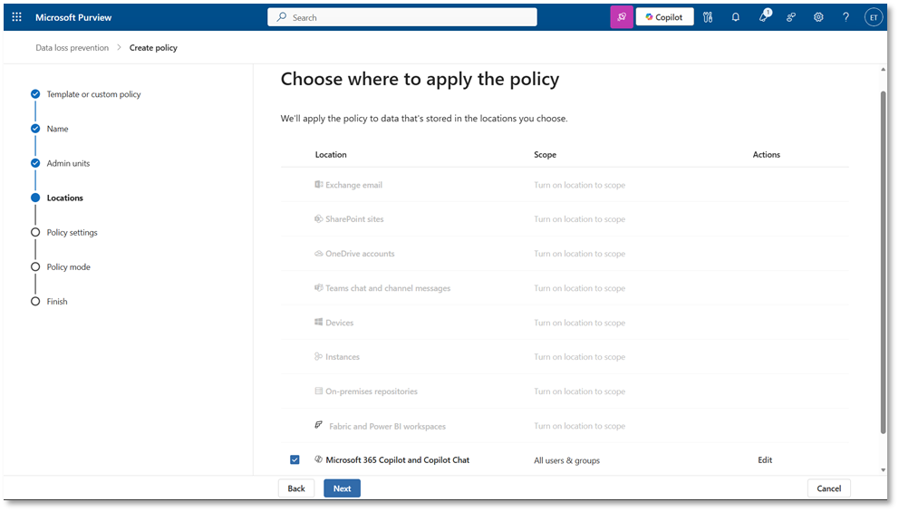 Choose where to apply the policy (Microsoft 365 Copilot and Copilot Chat).