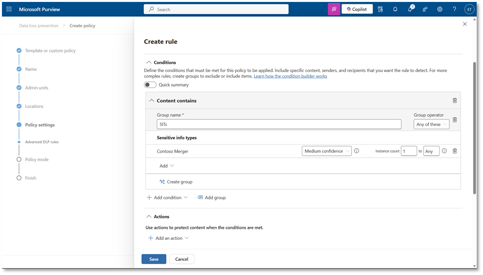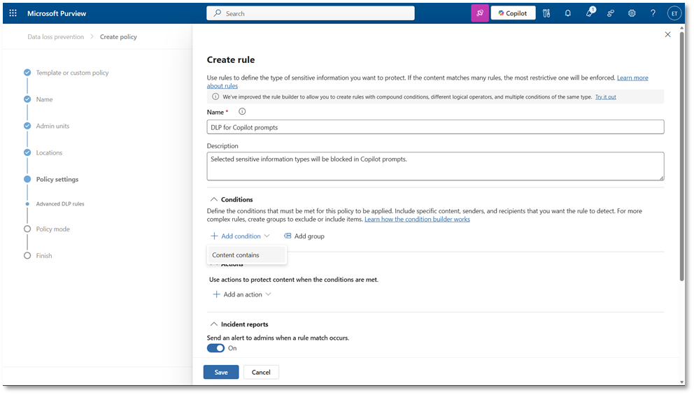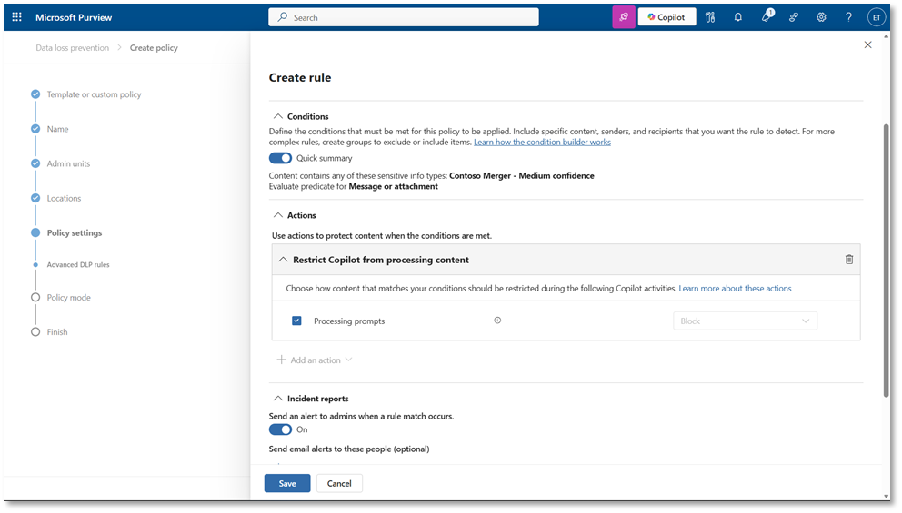 Add the action to restrict Copilot from processing content and complete the policy configuration.Confirm the rule was set up correctly by testing it out.