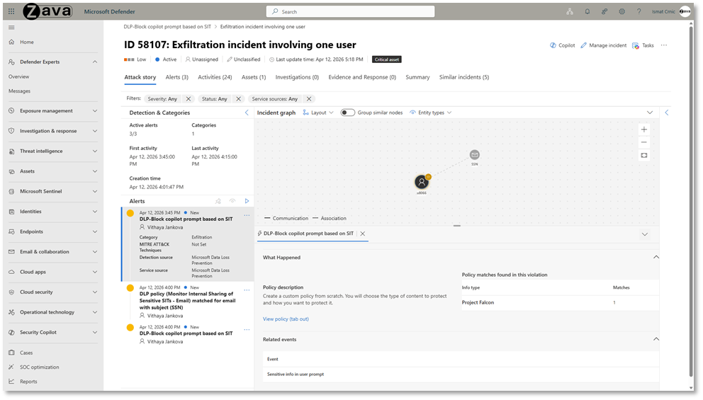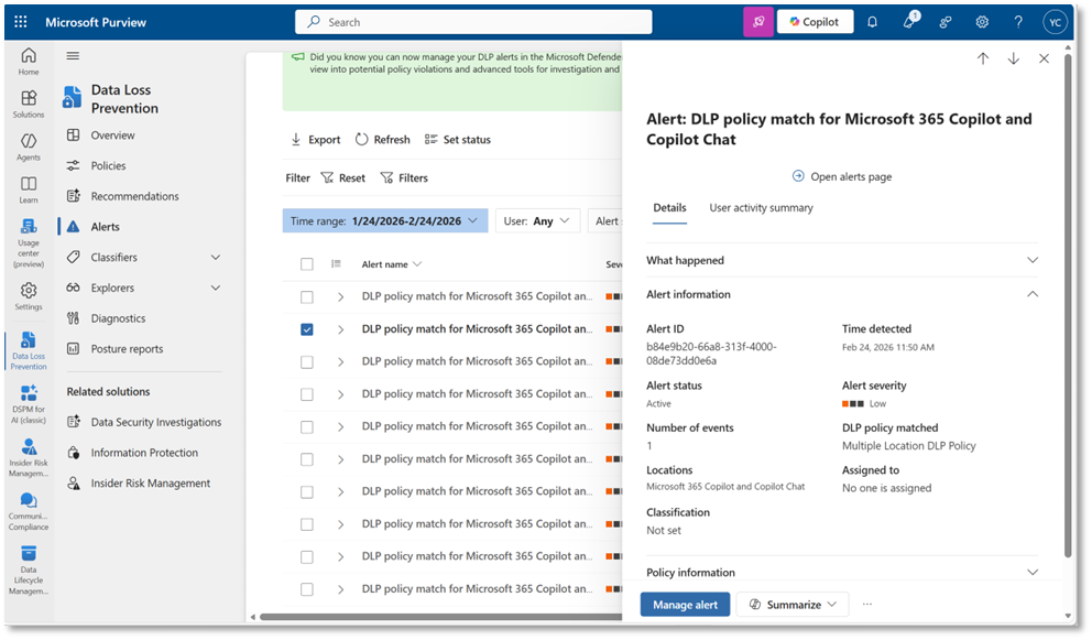 When a user’s prompt triggers a DLP policy, notifications and alerts are surfaced directly in the Microsoft Purview and Defender portals for security administrators. These alerts provide detailed information about which policy was activated, the type of sensitive information detected, and the context of the attempted Copilot interaction.