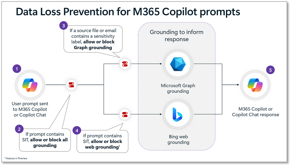 - Input: When a user submits a prompt, Copilot checks the prompt for sensitive information using built-in or organization-defined sensitive information types (SITs).