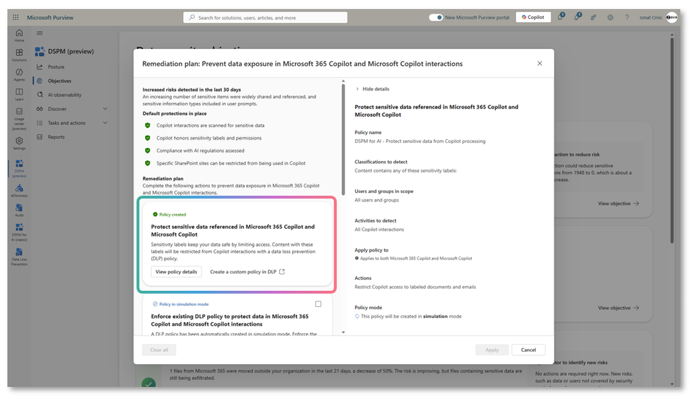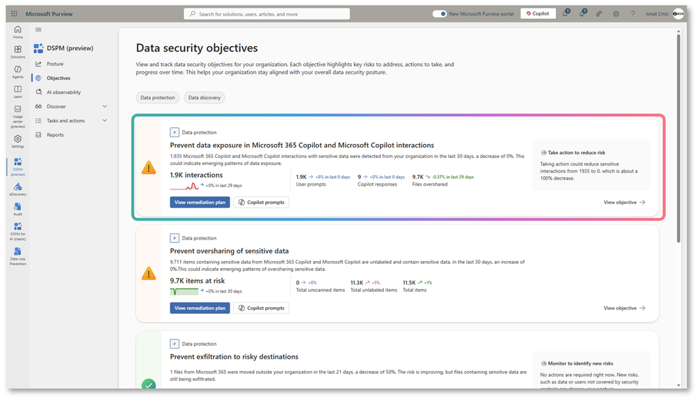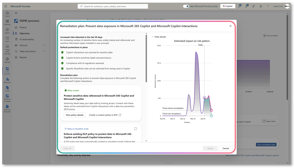 Navigate to the Data Security Posture Management (Preview) portal Objectives tab. View the objective, “Prevent data exposure in Microsoft 365 Copilot and Microsoft Copilot interactions” and click the button, view the remediation plan.View the remediation plan details and estimated impact on risk pattern.