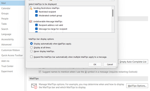 Steps: Outlook > File > Options > Mail > MailTips Options