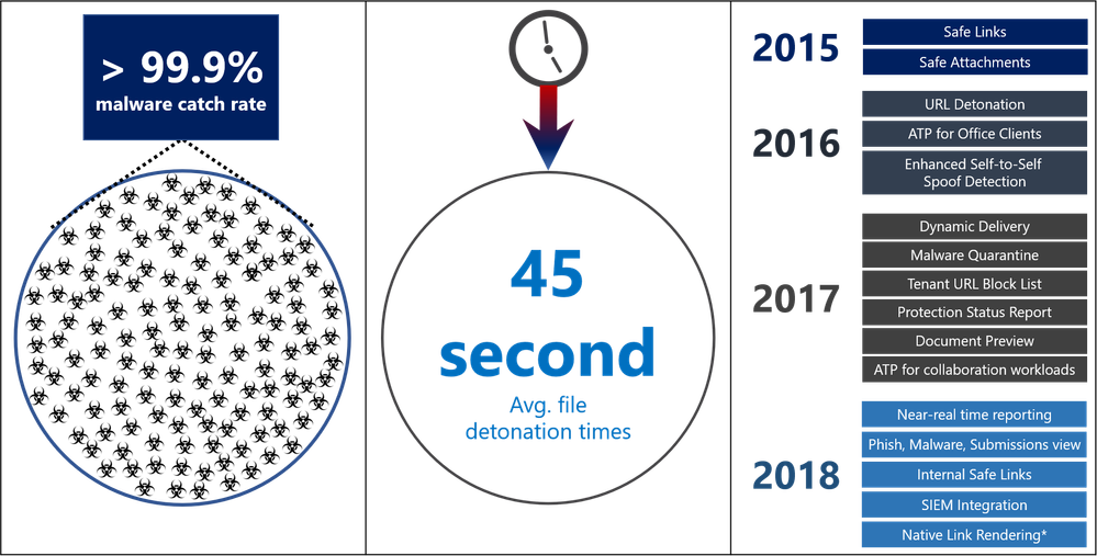 As we elevated Office ATP to the position of protecting more end users than all its peers combined, threat actors took notice. During 2017, our threat telemetry indicated that as our malware catch rate increased, the amount of malware being launched at Office 365 users decreased. The reduced ROI and growing difficulty of launching successful malware campaigns forced threat actors to evolve. We saw a spike in the number of phishing campaigns across the threat landscape where Office 365 mitigated 1 billion phishing emails in the second half of 2017 alone. These new campaigns had a level of complexity that signified an evolution in how phishing attacks were fundamentally designed and this prompted us to build upon the already powerful anti-phishing features in Office ATP and Exchange Online Protection (EOP). As we did for malware catch, file detonation times, and features, we focused more of our efforts on monitoring, understanding, and then further enhancing our technology to continue staying ahead of this new class of advanced, sophisticated, and often targeted phishing attacks. Over the next month, we will share with you the holistic strategy and layered technologies in Office 365 ATP that help stop modern phishing attacks. We encourage you to test these new capabilities in Office 365 ATP and provide your feedback. While no solution can ever guarantee 100% effectiveness against phish, we believe our technology framework and features provide the best solution available to help navigate through this sea of phish.