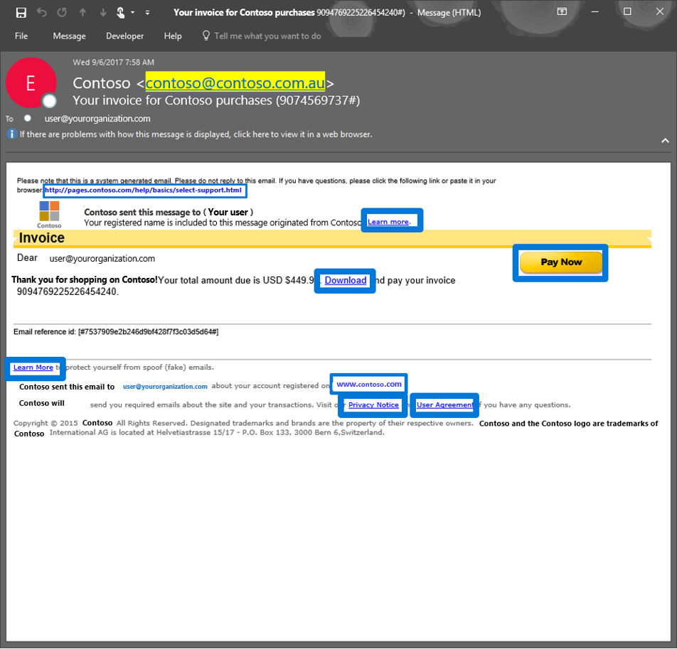 To understand the parameters included in our anti-impersonation capabilities, it’s important to understand the components of an email that serve as phish lures leading to user compromise. Figure 3 is a generic email where we have identified several, potential phish indicators. Phish indicators include the sender address, the sender name, and all the links including the ‘Pay Now’ image button. The links serve as phish lures which send end users to credential harvesting websites. Impersonation can happen via domain impersonation or user impersonation. Domain impersonation occurs when a commonly used domain is impersonated. For example, if the real domain is Contoso.com, a domain impersonation might be Ćóntoso.com. The subtle difference between the two domains is often missed by an end user. User impersonation is also a frequently used tactic where a sender email address is impersonated. For example, if my email address is debrajghosh@conotos.com an impersonated form would be debbrajghosh@contoso.com. Once more, the difference is subtle and often missed by the recipient.
