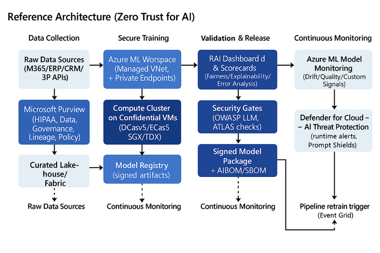 The Reference Architecture for Zero Trust in AI establishes a security-first blueprint for the entire AI pipeline—from raw data ingestion to model deployment and continuous monitoring. Its importance lies in addressing the unique risks of AI systems, such as data poisoning, model tampering, and adversarial attacks, which traditional security models often overlook. By embedding Zero Trust principles at every stage—governance with Microsoft Purview, isolated training environments, signed model artifacts, and runtime threat detection—organizations gain verifiable integrity, regulatory compliance, and resilience against evolving threats. Adopting this architecture ensures that AI innovations remain trustworthy, auditable, and aligned with business and compliance objectives, ultimately accelerating adoption while reducing risk and safeguarding enterprise reputation.  Below is a visual of what this architecture looks like: