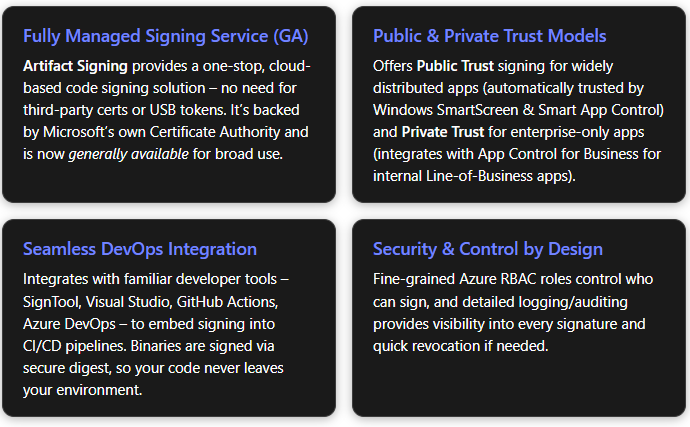 Artifact Signing is a fully managed, end-to-end code signing service that makes it easier than ever for Windows application developers to sign their apps securely and efficiently.