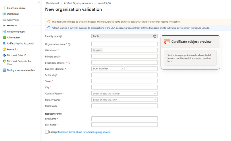 The entire validation process happens in the Azure portal. You simply submit your individual or organization details, and in some cases, upload supporting documents like business registration papers. Most validations are completed within a few business days, and once approved, you’re ready to start signing your apps immediately.