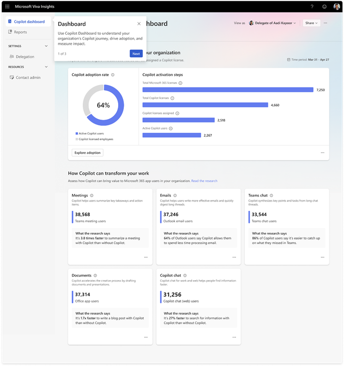 Miguel’s pivotal role consolidates data from multiple reporting sources — Microsoft 365 admin center, Copilot Dashboard, custom dashboards — across regions to identify best practices and guide champions in driving change and maximizing business impact.