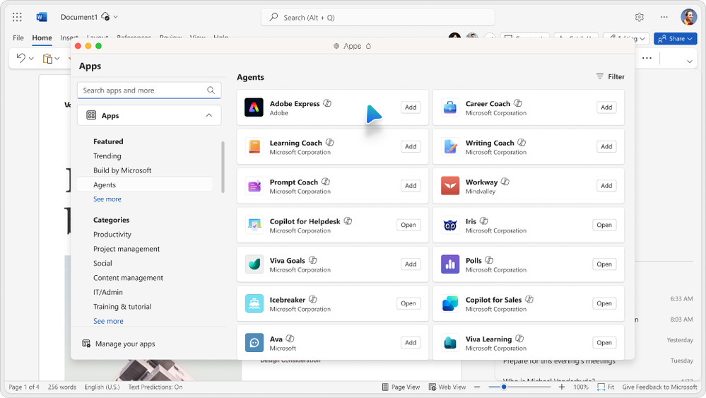 End users will soon be able to acquire, and use agents tailored to their specific workflows without leaving Copilot within their Word and PowerPoint documents. This seamless integration with the app store allows agents to read document context and insert items directly into your document. For example, you will be able to: