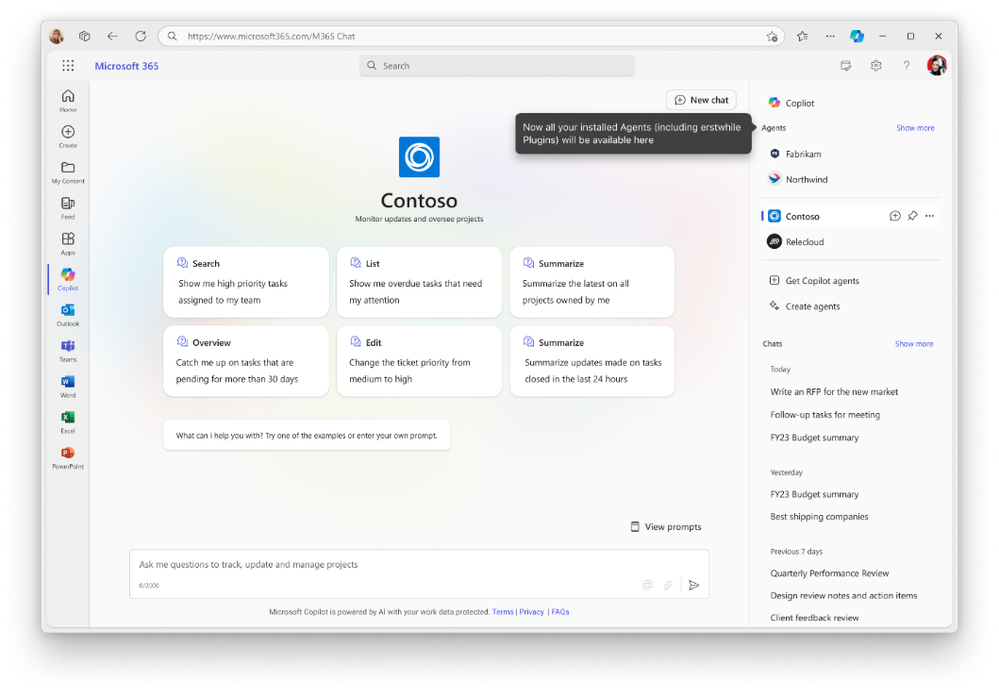 ISVs have worked with us through the Copilot journey, creating outstanding plugins for their customers. Plugins are components of agents that enable actions with external systems. ISVs that created plugins will have their plugins upgraded to agents in the user experiences by the end of the year. Users will now be able to access all their installed agents (including those built as plugins) via one location in Copilot. These upgraded plugins will show up in the right pane of Copilot just like any other agent and support agent experiences like focused chats. This upgrade will provide coherence in how users discover, install, manage, and use different types of agents.