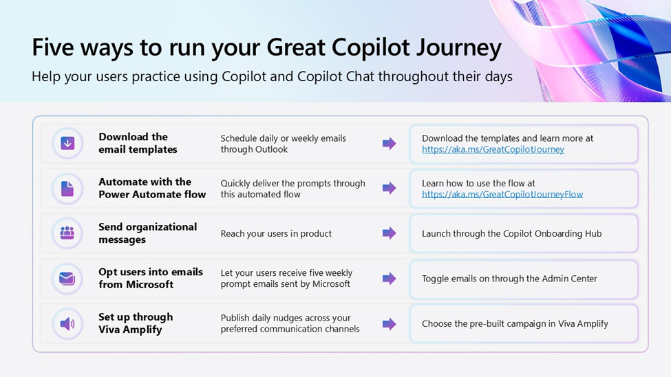 Whether you choose email templates, automation, or Microsoft-managed delivery, the goal is the same: help your people build Copilot habits that stick. Start your journey today!