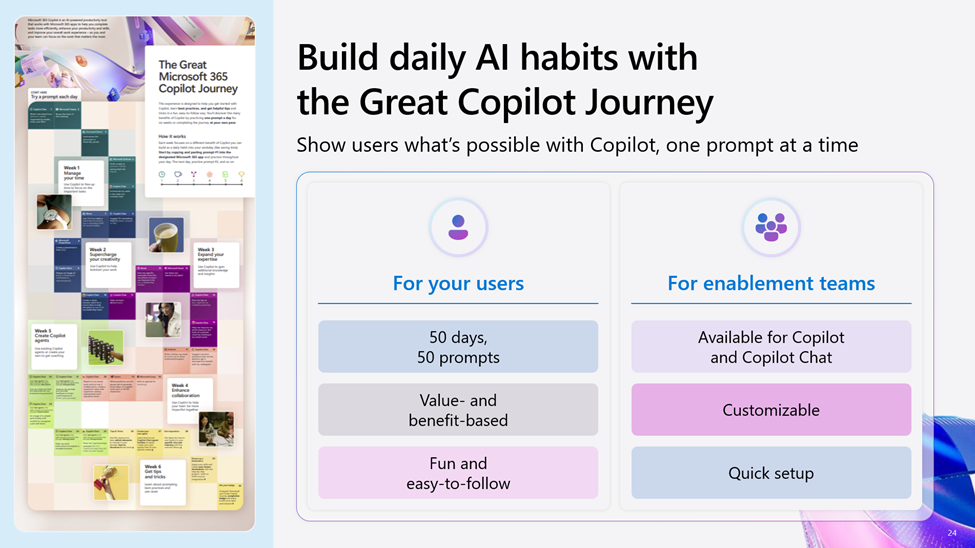 The Great Copilot Journey is a structured, habit-building program that delivers daily or weekly prompts to help users practice and explore Copilot in real-world scenarios. It’s available for both Microsoft 365 Copilot and Copilot Chat, making it easy for teams to learn how Copilot can streamline tasks, spark creativity, and boost productivity.