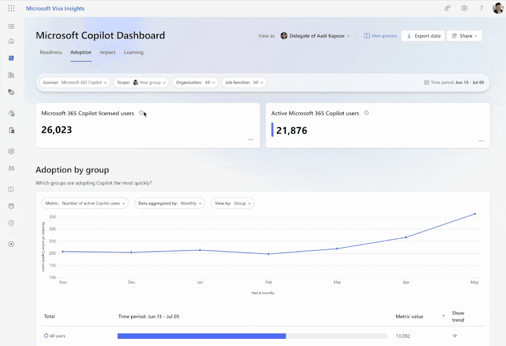 The Copilot Dashboard now offers new Copilot Chat adoption reports. These reports provide organizations with valuable insights into Microsoft 365 Copilot Chat adoption and usage. They enable users to view total users, track adoption trends by group, analyze usage intensity, and monitor retention. Additionally, these reports help organizations understand how different groups utilize Copilot Chat across various Microsoft 365 apps, helping leaders accelerate adoption and optimize Copilot Chat engagement across the organization.