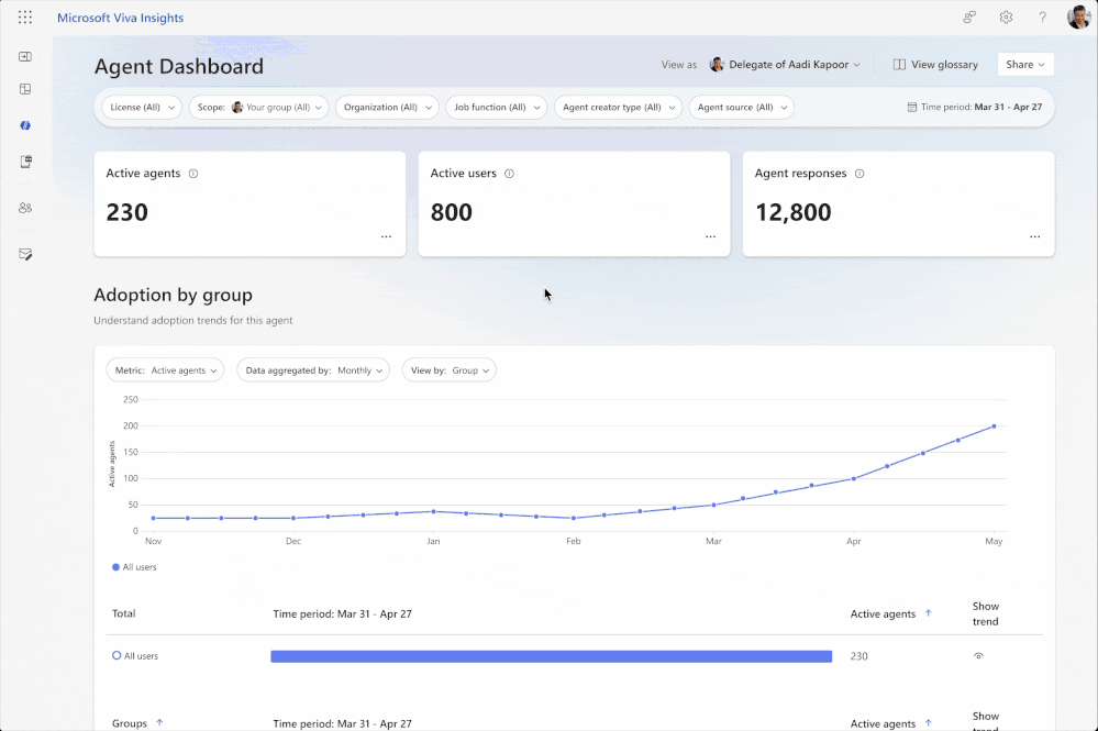 Understanding the adoption of agents in your organization and making data-driven decisions is critical. The Agent Dashboard provides a single, centralized view for tracking agent activity and adoption across your organization. Leaders, AI adoption specialists, and analysts can instantly monitor key metrics — including active agents, user engagement, responses, and usage retention — all in one place. The Agent Dashboard helps you analyze how different groups use agents to get work done. It’s easy now to identify your most popular agents, uncover how specific agents are used or deep dive into specific agents to measure performance at a more granular level. The initial release supports agents within Microsoft 365 Copilot, with plans to expand support to additional agent types and metrics in future updates. Private preview starts in December, with Public Preview to follow in January and a planned GA rollout in February 2026.