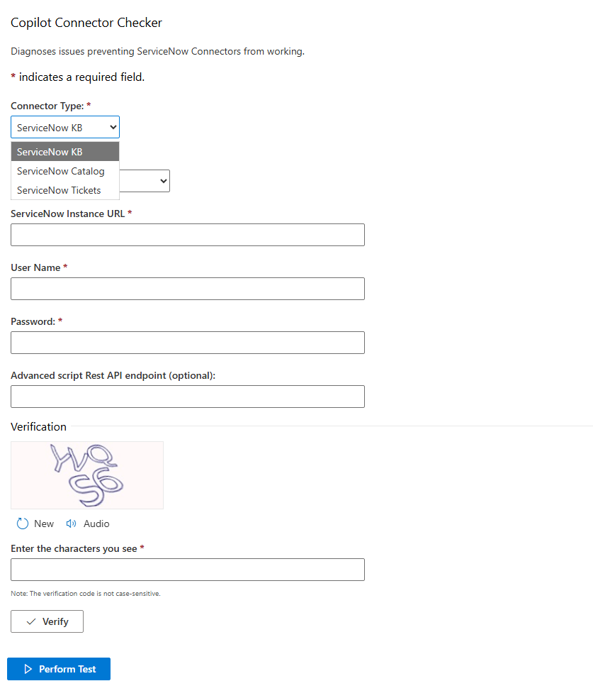 c. Enter the required parameters (as shown in the example below) and select “Perform Test.”
