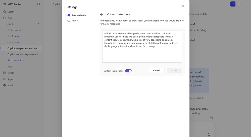 • Custom Instructions: You can explicitly tell Copilot how you want it to behave—like “Keep my emails concise” or “Use a formal tone”—and it will apply those preferences automatically in future interactions.