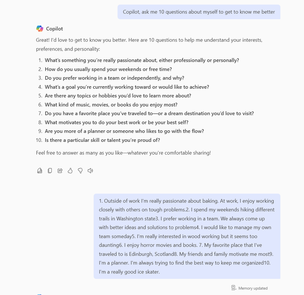 • You’ll see a subtle “memory updated” signal when Copilot remembers something new