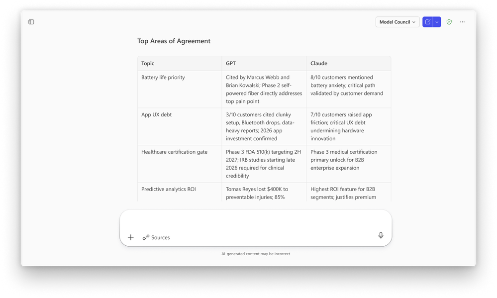 Council brings multiple model responses side-by-side in the Researcher experience. Additionally, a cover letter provides valuable insights on where the models agree, where they diverge, and the unique insights each brings on the topic.