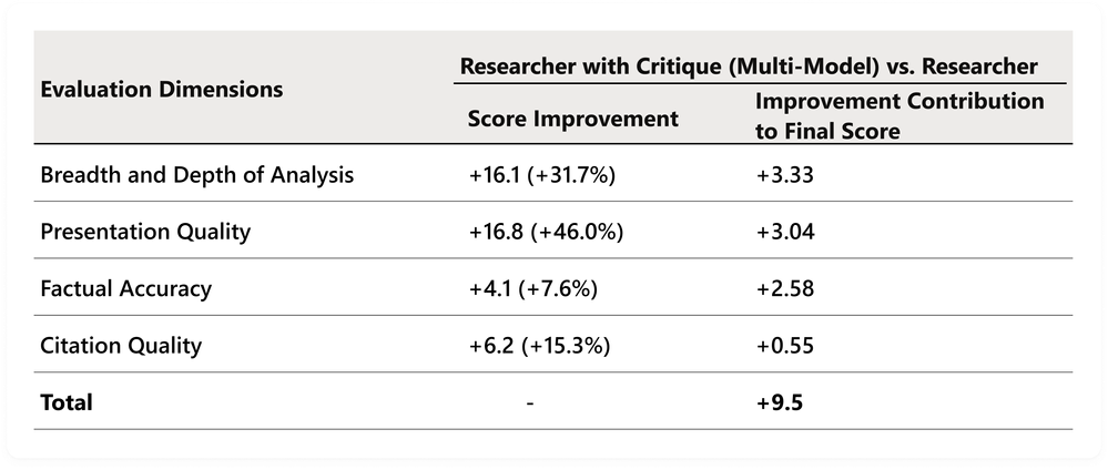 Critique pushes Researcher to identify missing analytical angles, close coverage gaps, sharpen formulations, and produce responses with stronger organization and clearer narrative flow. This accounts for the substantial improvements to the breadth and depth and presentation quality scores. The factual accuracy gain shows that Critique is challenging weak claims and enforcing higher precision. Citation quality improvements primarily reflect better use of existing sources, as the new layer emphasizes evidence selection and citation rather than increasing source coverage.
