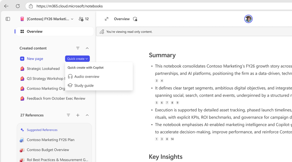 - Engage with Copilot: Ask Copilot questions, request summaries, or generate Audio Overviews, all grounded in your notebook content.