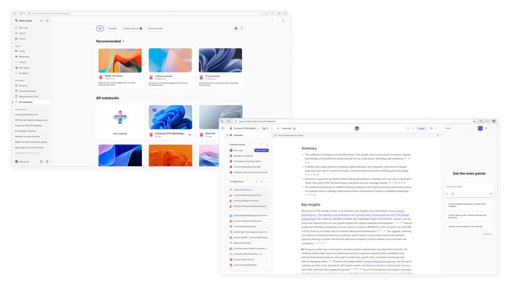 Work today isn’t short-lived or linear. Projects span months, inputs come from everywhere across files, meetings, and conversations, and real progress depends on how well teams understand evolving information while turning all of it into clear decisions, updates, and deliverables. That’s why we’re excited to announce the general availability of the refreshed Copilot Notebooks experience across Microsoft 365 Copilot app and OneNote. With an updated three-column layout and powerful Copilot features like Audio Overview and Study Guide, Copilot Notebooks are your workspace for gathering and thinking on a topic or project over time.