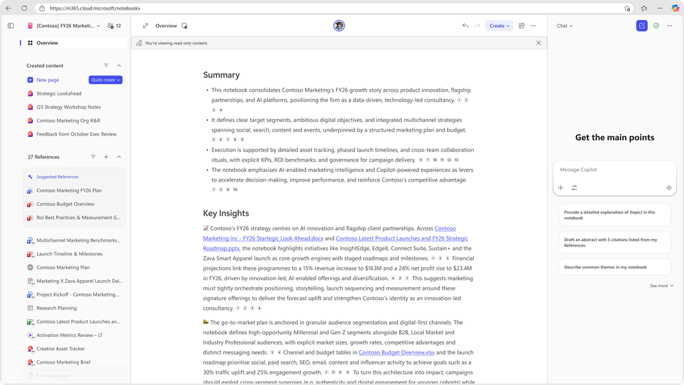 Think of a notebook as a long-lived collaboration space where AI works with your information, not around it. You can ask Copilot questions, synthesize themes, generate drafts, explore insights, and create artifacts, all while staying anchored to the same shared set of references and instructions.