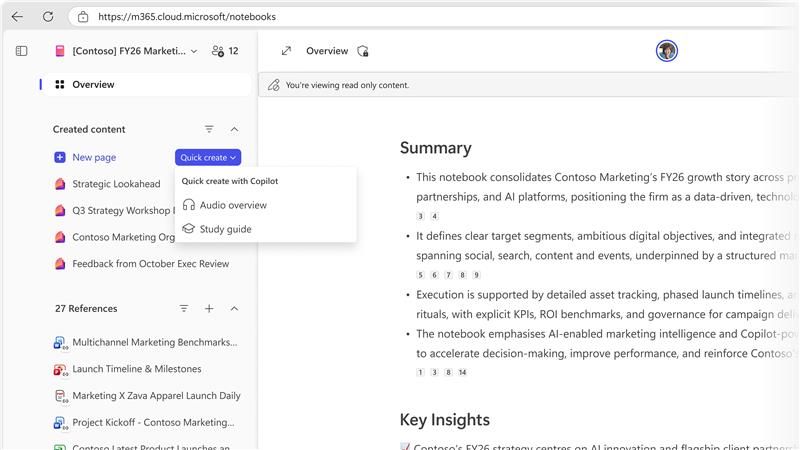 - Engage with Copilot: Ask Copilot questions, request summaries, or generate Audio Overviews, all grounded in your notebook content.