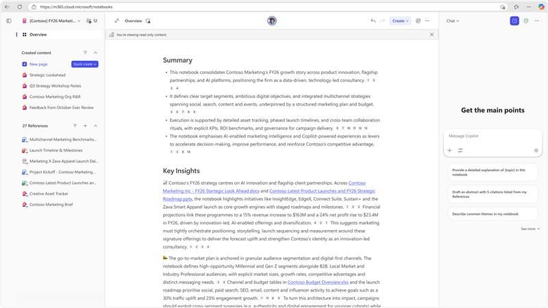 Think of a notebook as a long-lived collaboration space where AI works with your information, not around it. You can ask Copilot questions, synthesize themes, generate drafts, explore insights, and create artifacts, all while staying anchored to the same shared set of references and instructions.