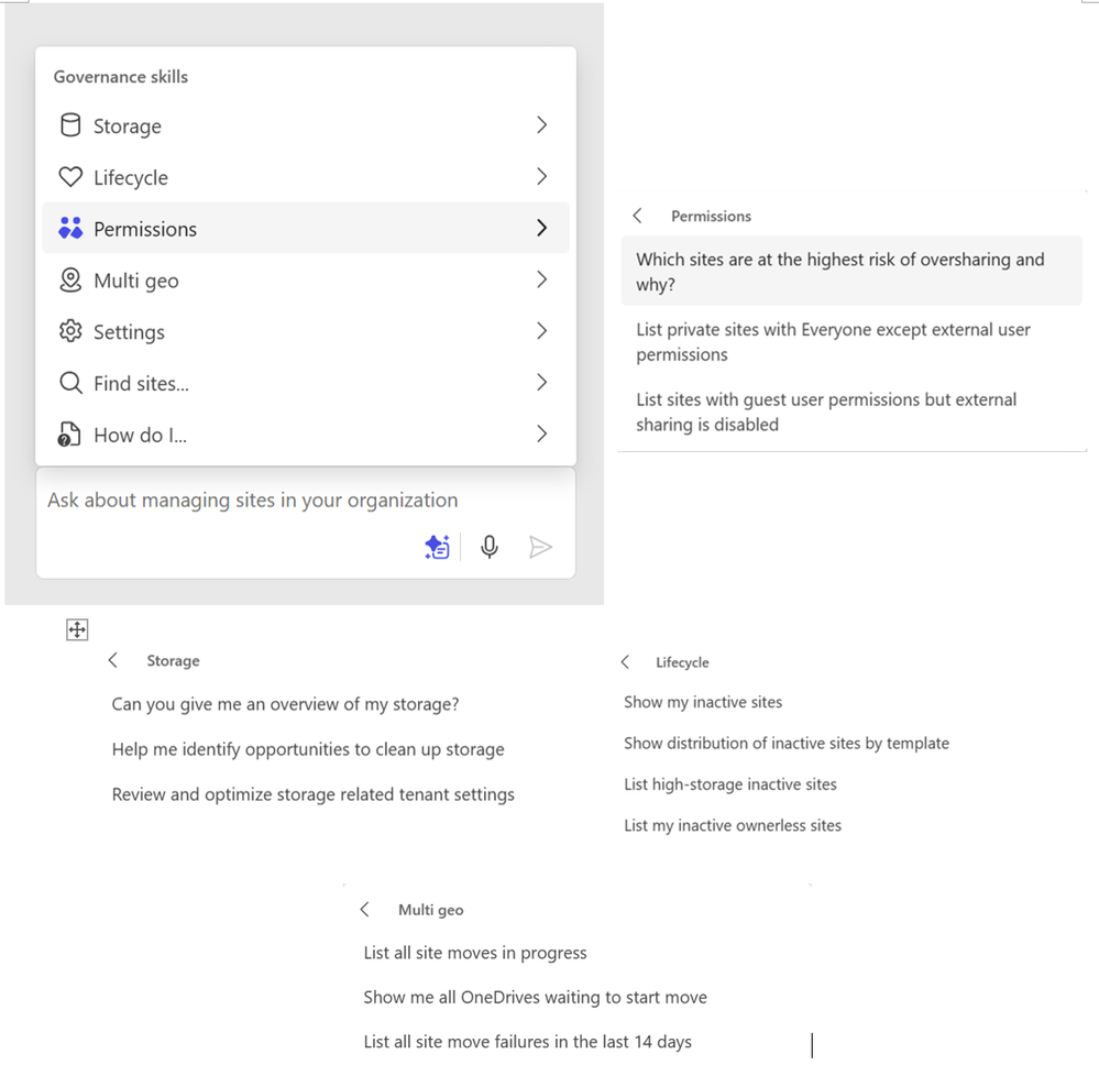 You can try various starter prompts categorized under various skills – Permissions, Lifecycle, Storage, and Multi-Geo.