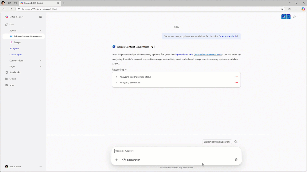The Recovery skill helps admins leverage the Microsoft 365 Backup tool to find and understand available restore points, so that you can more easily and quickly recover from events that require point in time recovery of your OneDrive or SharePoint data. The initial release focuses on restore point availability if you have enabled Microsoft 365 Backup and have onboarded OneDrive accounts or SharePoint sites. In the future it will provide recommendations based on activity.