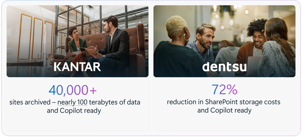 *Stats based on customers’ testimonials. Read more at aka.ms/M365Archive/Story/Kantar and aka.ms/M365Archive/Story/DentsuSharePoint Extra Storage PAYG meter – Public Preview in June 2026